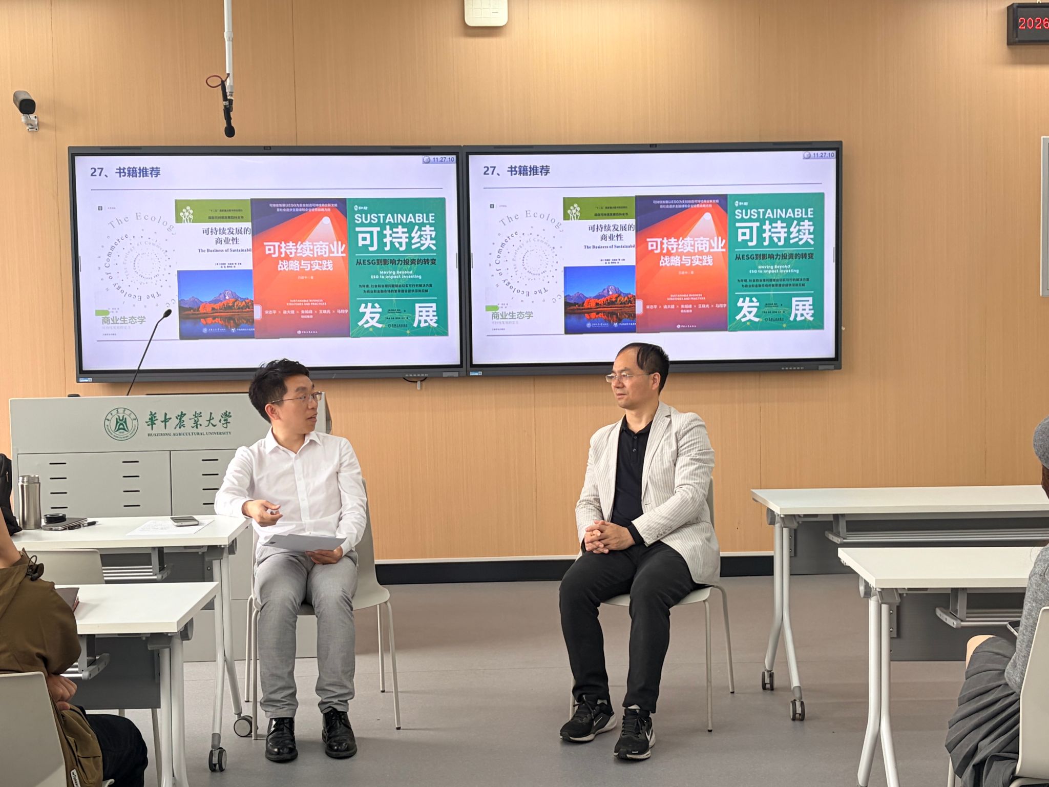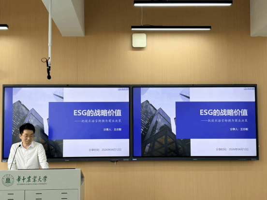 2026年4月12日上午10:00,华中农业大学MBA专题讲座第154期在二教402举行。此次讲座由王勇老师邀请校外嘉宾、华中农业大学校友、湖北平安电工科技股份公司总经理助理兼ESG主任工程师王志敏走进课堂,面向MBA同学们作题为“ESG的战略价值——把技术语言转换为商业决策”的专题分享。王志敏结合自身多年深耕ESG、可持续发展与上市公司管理实践的经验,从企业真实场景出发,系统讲解了ESG如何从“合规要求”走向“战略决策”,为同学们带来了一场兼具前沿视野与实践价值的精彩讲座。